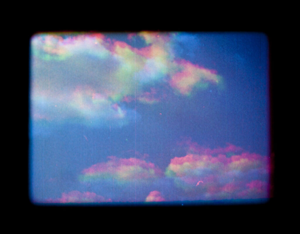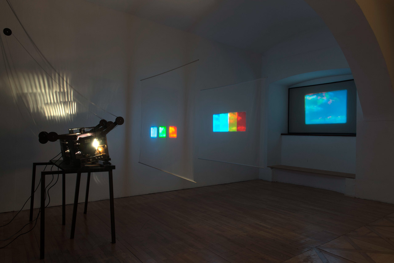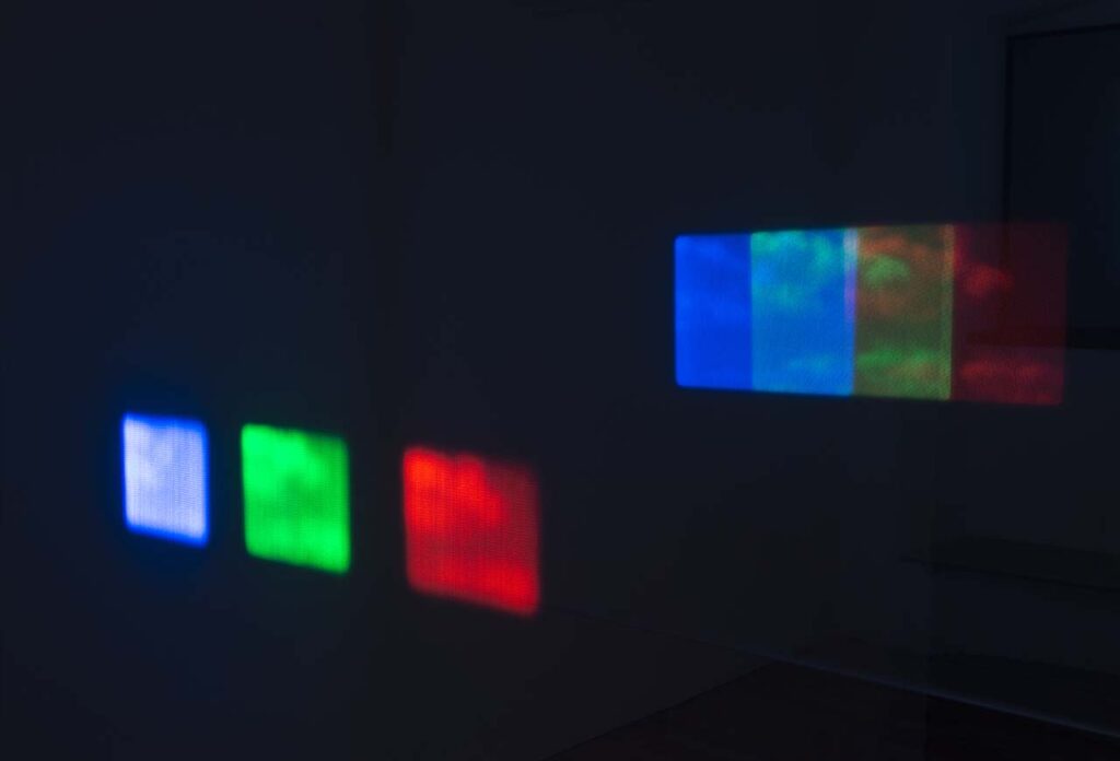 Schmid uses three 16mm loops of clouds, filmed through red, green and blue filters and projected through a filter of the same color onto three staggered screens. The closest screen presents a triptych, with each color presented separately; as it bleeds through onto a second translucent screen further away, the image now overlaps, the clouds sliding past each other; finally, the third opaque screen presents all three colors in one single image, the culmination of the process. A sculptural installation that directs interest towards each individual component. What if color film ceased to exist? Schmid asks this question in all seriousness, and provides an answer of sorts: return to the past and start again… (Text: Kim Knowles)