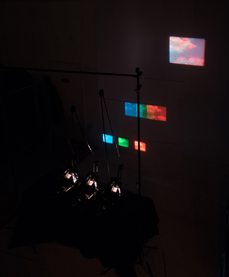 Installation: 3 x 16mm projectors, 3 projection screens, B&W film with colored filters, 2014